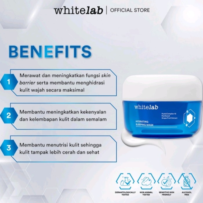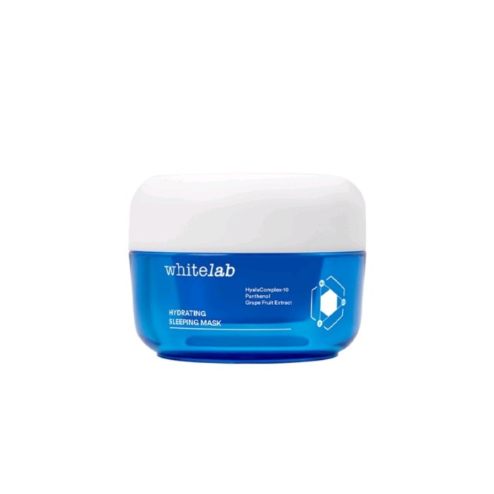 Whitelab Sleeping Mask Diformulasikan dengan kekuatan 3 kandungan utama HyaluComplex-10, Panthenol, dan Grape Fruit Extract yang dapat secara sinergis membantu melembapkan, meningkatkan, dan mempertahankan level hidrasi kulit, serta merawat dan mempertahankan fungsi skin barrier wajah. Pelembap ini juga dapat membantu menutrisi kulit sehingga kulit tampak lebih lembap,