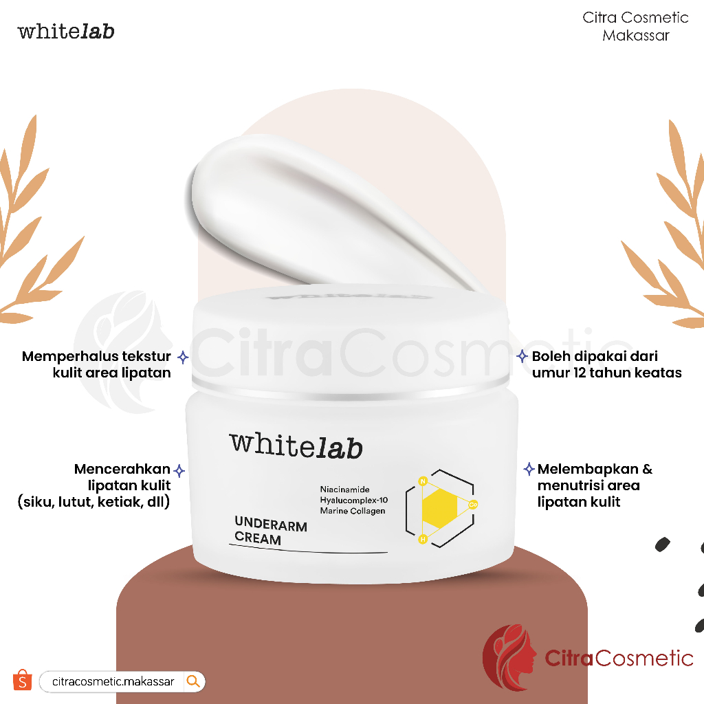Whitelab Underarm Cream menggunakan 2 kandungan utama, yaitu NIACINAMIDE + COLLAGEN. Niacinamide berperan untuk mencerahkan kulit, melembabkan kulit, menyamarkan noda hitam. Sedangkan Collagen berperan penting untuk meningkatkan elastisitas kulit dan mencegah tanda penuaan kulitmu.