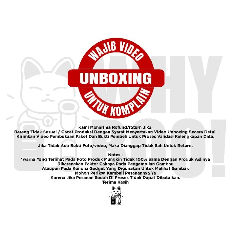 Kami menerima refund/return jika, Barang tidak sesuai / cacat produksi dengan syarat menyertakan video unboxing secara detail. Kirimkan video pembukaan paket dan bukti pembeli untuk proses validasi kelengkapan data.