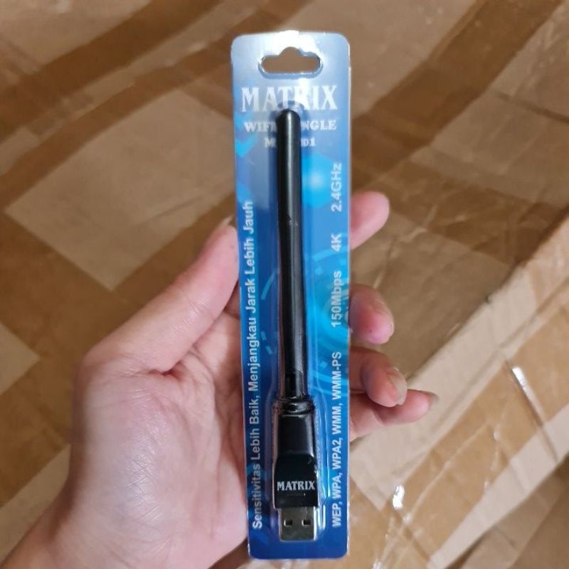 Features USB WiFi Dongle / Adapter Matrix: - Main Chipset: Mediatek MTK7601UN. - Wifi: 802.11N, kecepatan hingga 150 Mbps, 4K, 2,4 GHz. - Antena: 5 dBi - Tegangan: DC 5.5 Volt - Arus: <160mA