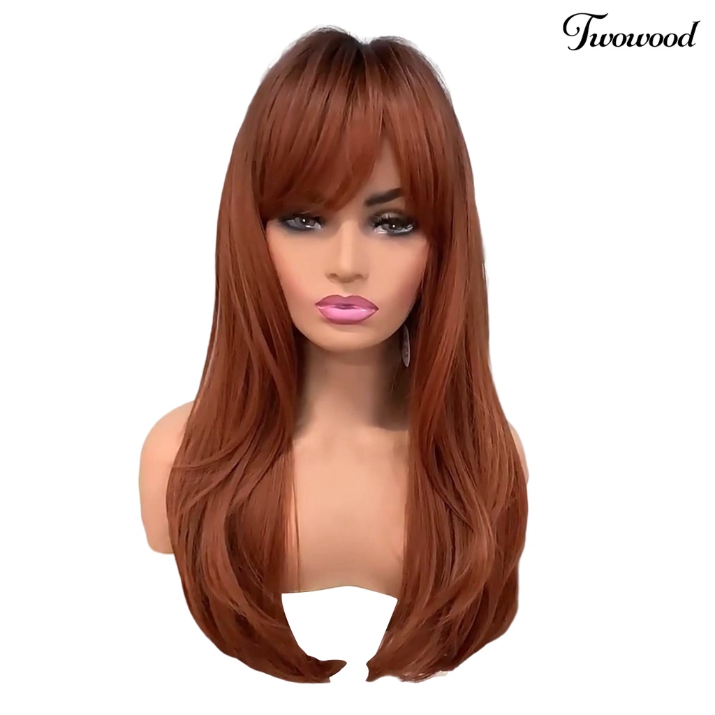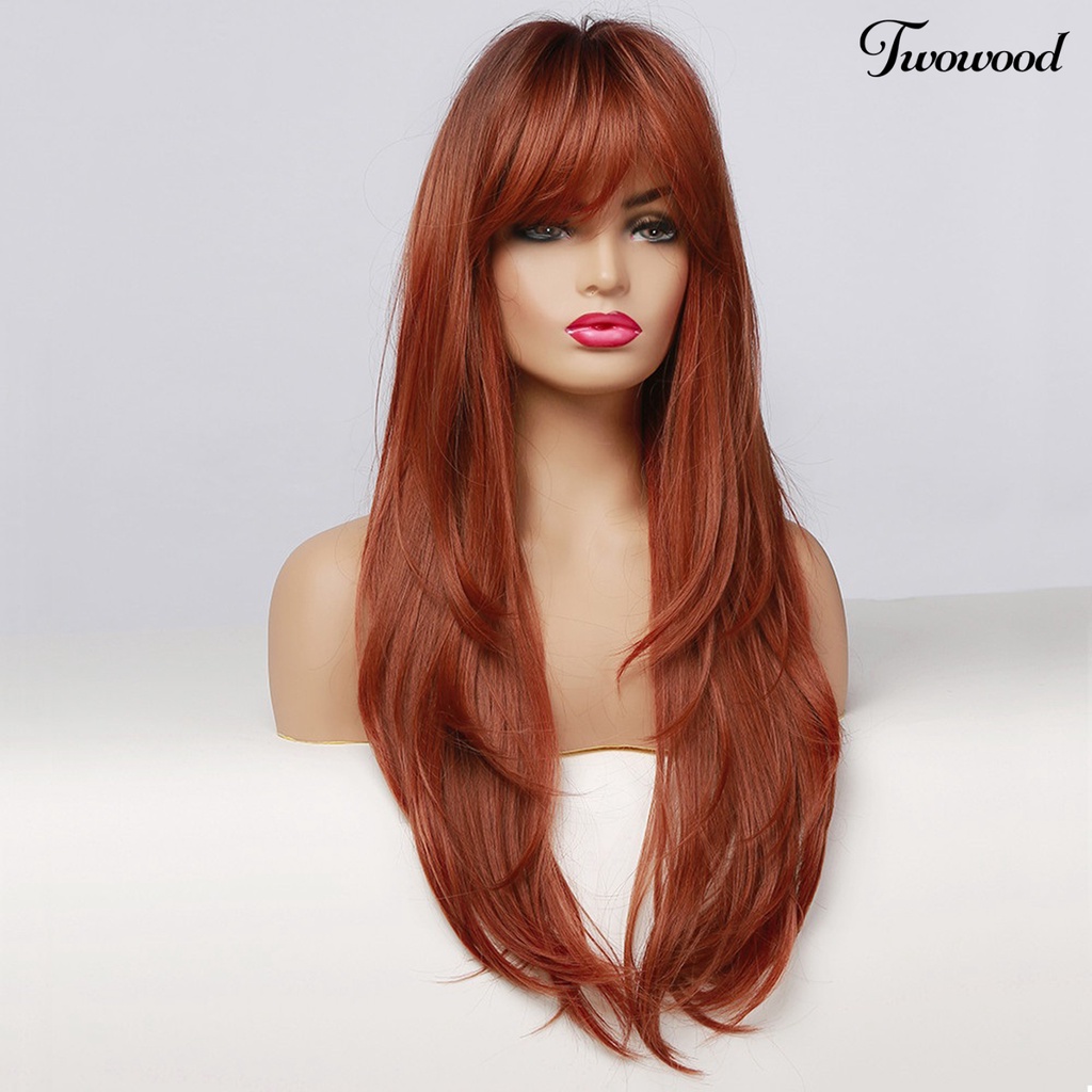 Detail Wig Cosplay Twowood Dyed Halus Ringan Merah-Coklat Wig Poni Miring Lurus Panjang Untuk Kehidupan Sehari-Hari