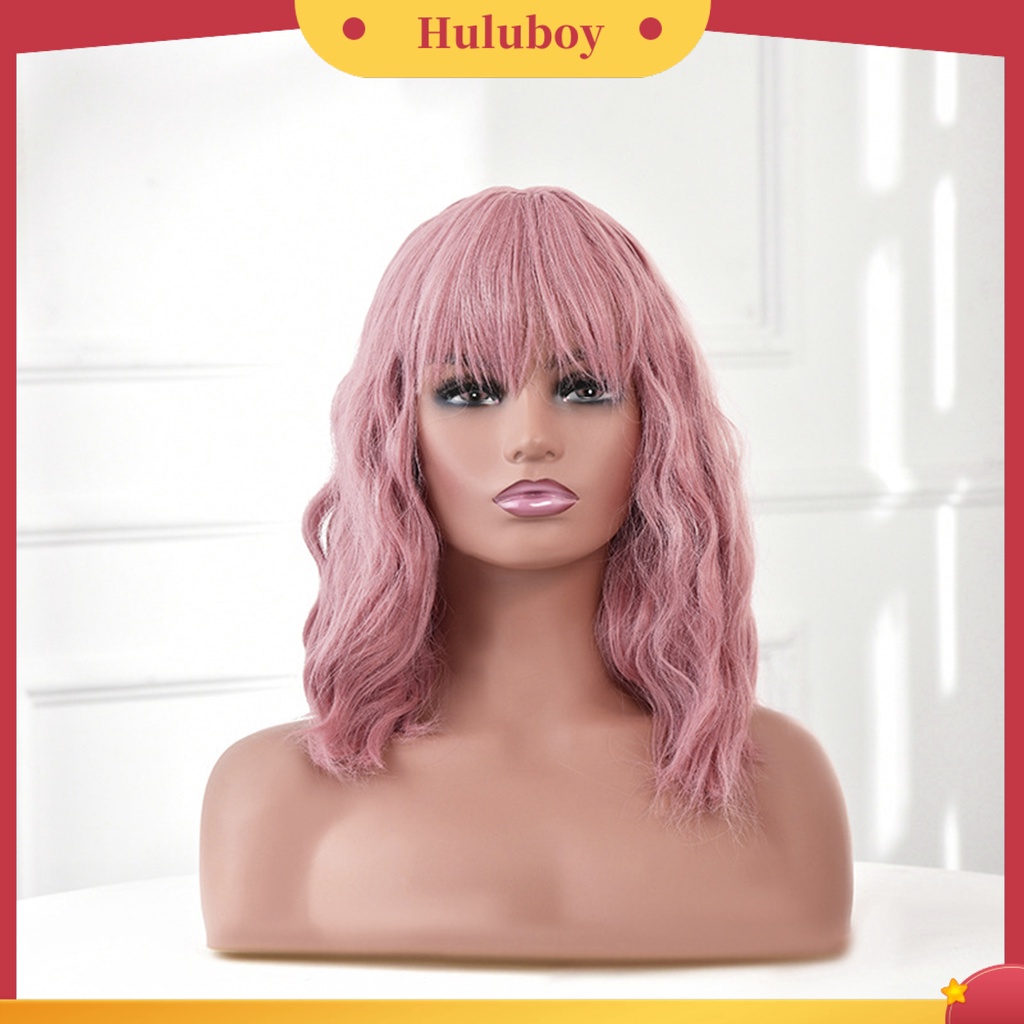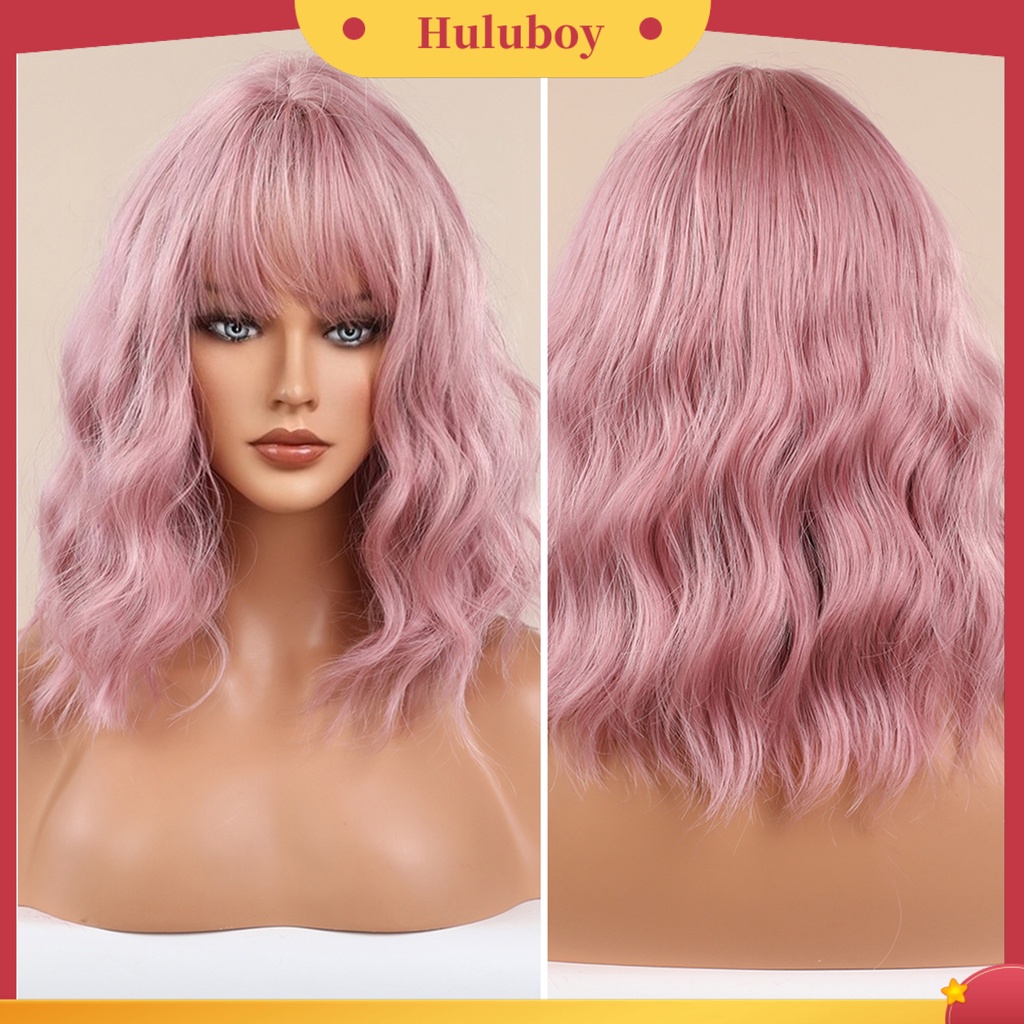 Detail Wig Rambut Keriting Medium Ringan Dengan Poni Warna Pink Untuk Pesta Cosplay