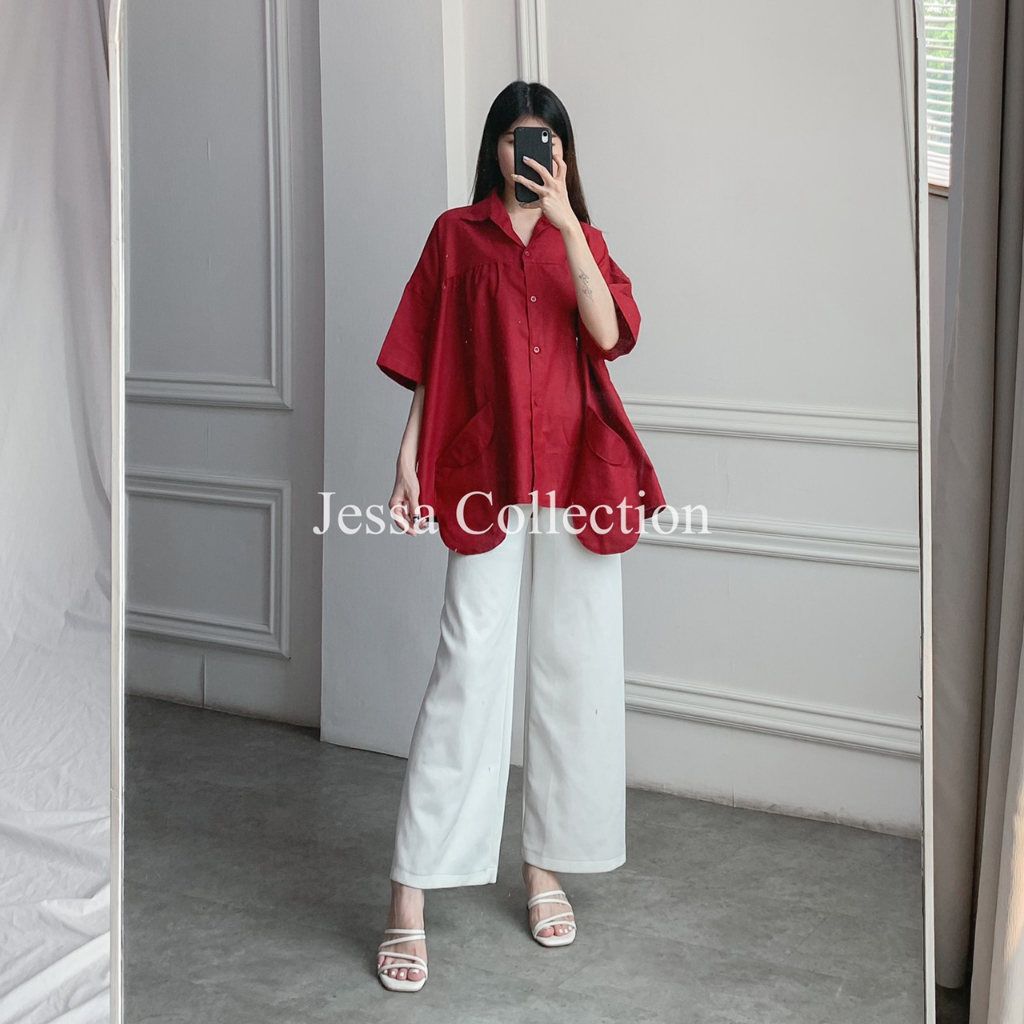 Winnial Pocket Blouse IDR 80,000 Available in Teal, Fuchsia, Broken White, Electric Blue, Black and Maroon Material : Linen LD : 130cm Length : 67cm *warna sesuai foto gantung *kancing hidup *grosir minimal 6pcs warna bisa dicampur disc 10,000/pcs