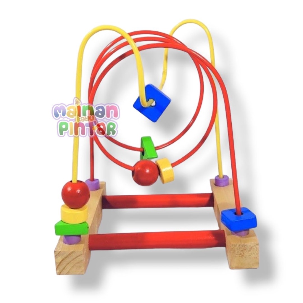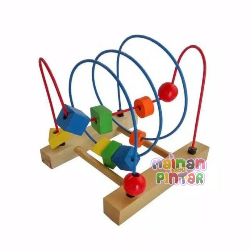 Fiture produk : - berbahan dasar kayu dan kawat berpengaman. - memiliki warna warni menarik yaitu merah, kuning, biru, hijau dan ungu - terdiri dari dua alur kawat berlekuk. - terdiri dari 4 balok bentuk yaitu segitiga, lingkaran, bundar dan segiempat