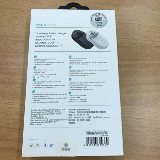 Specifications: * Model : AC1530 * Standard: Qi standard * Input: DC 5V2A * Output: DC 5V~1A * Lighting Output : 5V-1A * Charging Port: Micro-USB port * Transmitting distance: <8mm * Material: ABS * Color: Black and White
