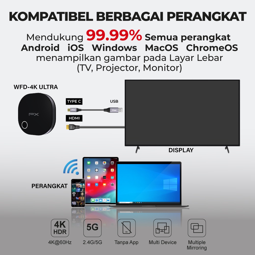 SPESIFIKASI Merek : PX Model Produk : WFD-4K Ultra Resolusi : 720P/1080P/2K/4K Catu Daya : USB 5V/2A Port : HDMI 2.0/USB Type C Bandwith : 2.4G/5G Sistem : Android/iOS/Windows/MacOS/ChromeOS