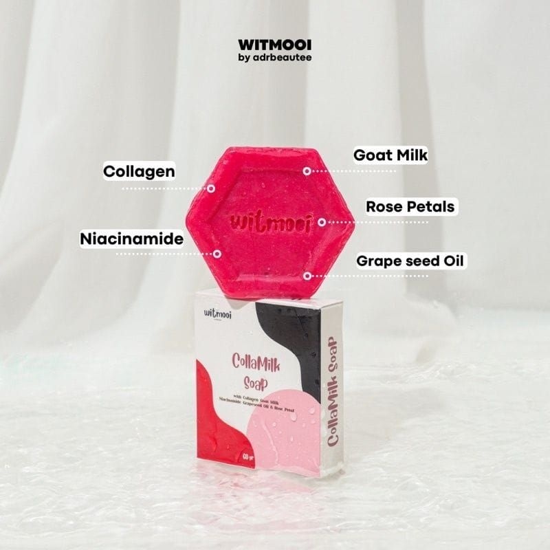 Witmooi CollaMilk Soap mengandung Collagen dan Goat Milk yang memelihara kelembaban dan kehalusan kulit. Diperkaya Niacinamide, Grapeseed oil sebagai brightening agent dan emollient juga Rose Petal yang kaya antioxidant. Kulit senantiasa bersih, cerah, lembab dan halus.