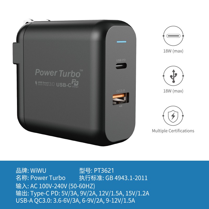 WIWU PT3621 - Power Turbo Charger Dual Port with Power Delivery 3.0 & QC3.0 Charger (36W MAX)