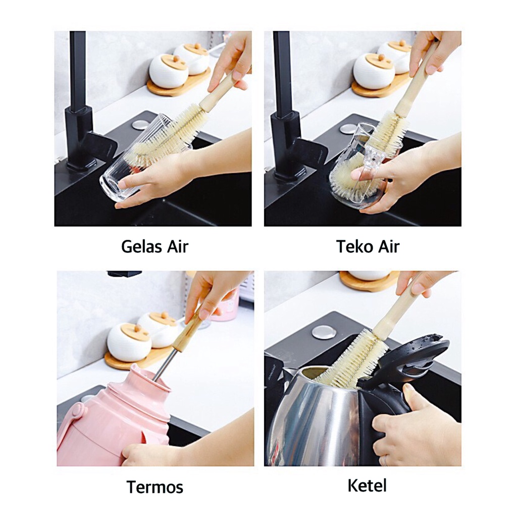 Keunggulan Produk : 1. Desain kepala sikat berbentuk L, ukuran pas dengan mulut botol dan bagian bawah botol, sangat membantu dalam membersihkan kotoran-kotoran yang ada disudut sisi sulit dibersihkan. 2. Bulu sikat sangat lembut, elastis, serta tidak rontok dan tidak merusak botol. 3. Desain gagang pegangan yang nyaman, terbuat dari bahan kayu berkualitas tinggi, sesuai dengan prinsip ergonomis, tidak licin meskipun disaat tangan lagi basah. Untuk ujung gagang tersedia lubang untuk digantung ke dinding. 4. Mudah dibersihkan, cukup dibilas dengan air bersih. 5. Bersifat multifungsi : bisa untuk membersihkan botol susu bayi, vas, gelas, botol minum,dll.