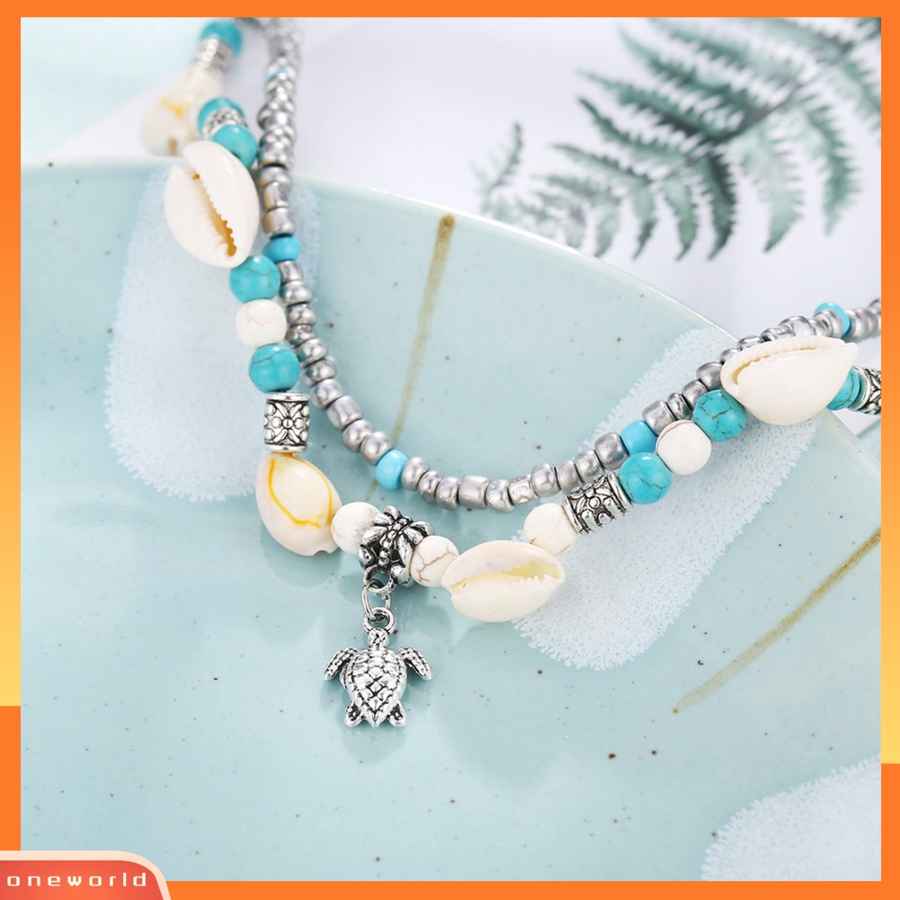 Detail [WOD] Wanita Turtle Charm Faux Turquoise Manik-Manik Lapisan Ganda Gelang Kaki Perhiasan Pantai