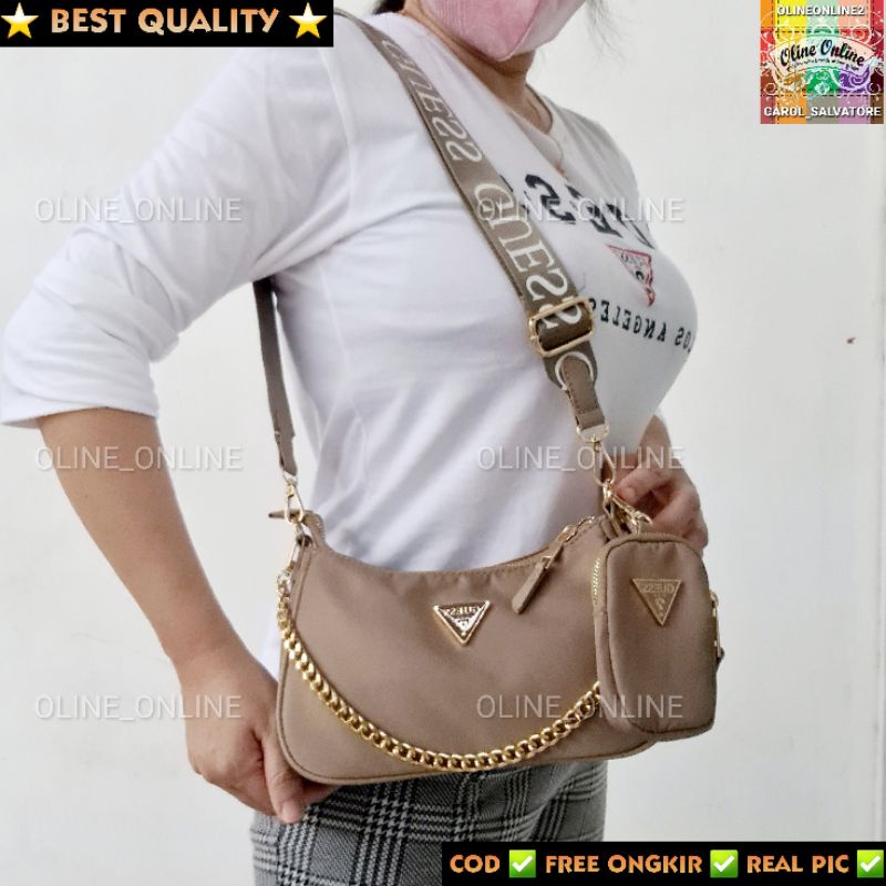 Tas Wanita > Tas Selempang & Bahu Wanita > (WODB) tas NEO nylon crossbody with small pouch rantai gold chain logo straps khakis black gs cream gb shoulder bag jinjing hand carry