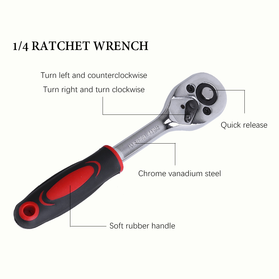 Deskripsi: Soket menggunakan baja vanadium krom berkualitas tinggi 50 bv30 membentuk tekan dingin, torsi 50% lebih tinggi dari baja karbon, menggunakan pemrosesan permukaan halus yang lebih rendah, efek pencegahan karat yang baik. Kepala batch mengadopsi bahan cr-v, kekerasan lebih kuat, ketangguhan lebih tinggi. Cepat ratchet wrench jatuh (positif dan negatif disesuaikan), fitur rilis cepat tombol tekan memastikan bahwa soket terkunci dengan aman saat digunakan, tetapi juga memungkinkan untuk dengan mudah melepas atau perubahan cepat soket evev dengan jari berminyak atau berminyak. dan ratchet 45 gigi berkualitas tinggi kami dapat meningkatkan kecepatan operasi. Apakah bukaan gas, di AC, mur jok, spatbor ban, kunci pintu mobil, rumah (isi dasar) biasanya digunakan dalam setelan mur ulir yang ideal dari satu set alat