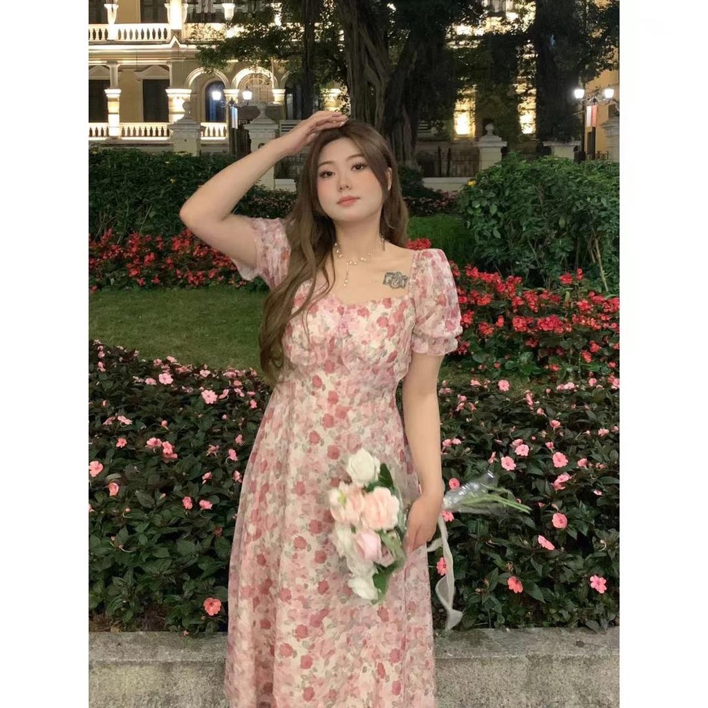 Detail 『Wu Lekvar』Gaun Princess Lengan Pendek, Gaun Mawar Panjang Ukuran Sedikit Besar, Rok Maxi Motif Bung