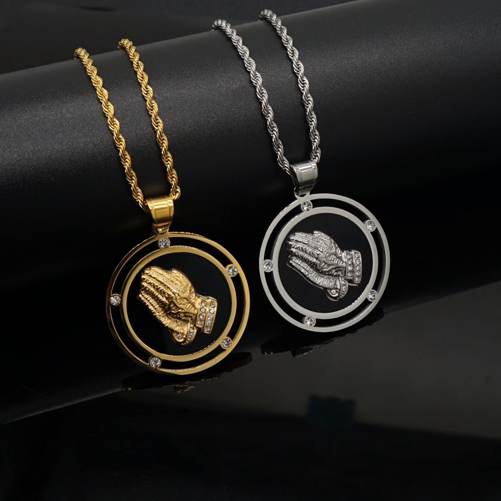 [X C Kalung] 18K Gold Plated Hip Hop Hipster 316stainless Steel Gold Plated with Diamond Hollow Doa Buddha Tangan Liontin Kalung Untuk Pria Dan Wanita