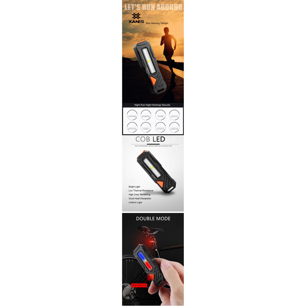 Spesifikasi Merek: XANES Model: TL06 Material: PC Material Light Bead: COB Light Board + LED Alarm Lamp Pengisian Daya: USB Power Supply Ukuran: 802615.6mm Berat: sekitar 24g Mode: Ganda Peringatan Flash Strobe- Flash Lambat- Flash Cahaya Putih Kuat Ringan-Sedang Ringan- Cahaya Rendah Tahan air: Ya