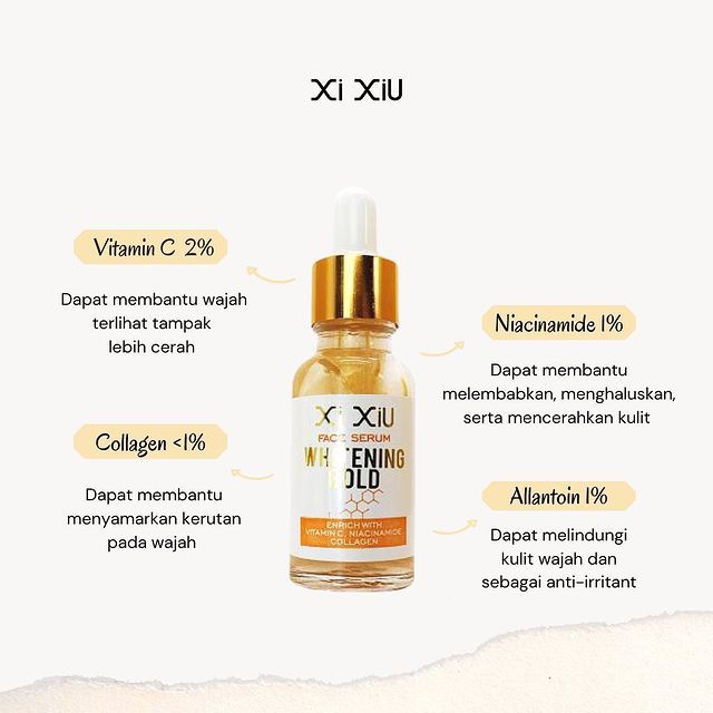 Xi xiu face serum VITAMIN C dengan double brightening active ingredients yaitu vitamin C dan niacimade yang diketahui dapat membantu wajah terlihat tampak cerah dan kandungan Al antoine sebagai anti irritant.