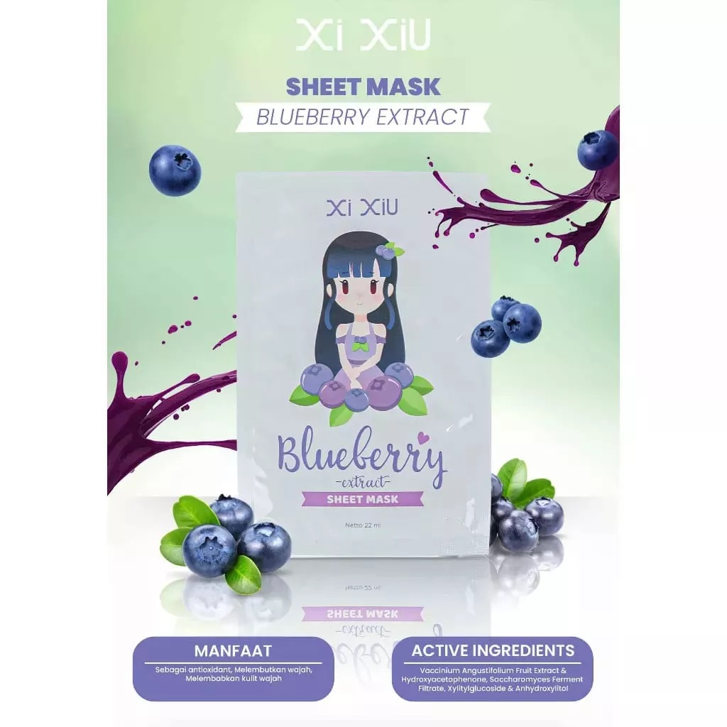 2. BLUEBERRY EXTRACT SHEET MASK Active Ingredients : - Vaccinium Angustifolium Fruit Extract dan Hydroxyacetophenone yang berfungsi sebagai antioxidant - Saccharomyces Ferment Filtrate untuk merawat kulit wajah agar terasa lembut - Xylitylglucoside & Anhydroxylitol yang dapat membantu melembabkan kulit