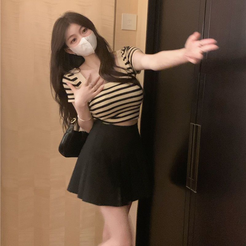 Xiacnee Rok Rajut untuk Wanita, Gaun Bergaris untuk Wanita, Rok Pinggul Pendek Rajut Kerah Persegi P