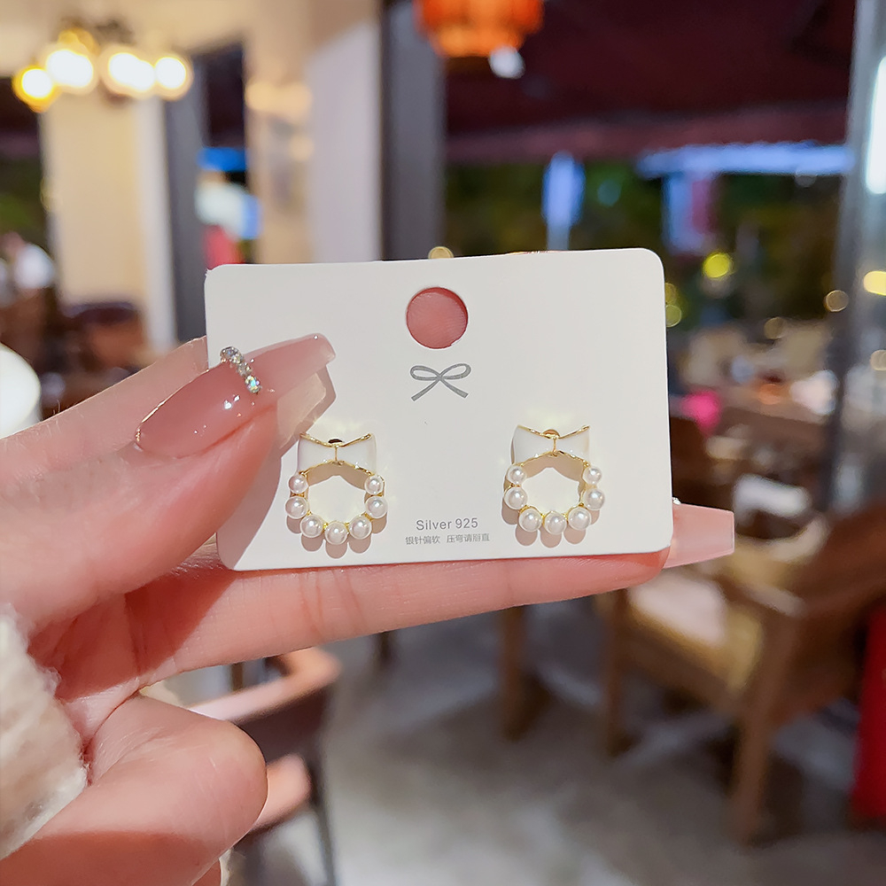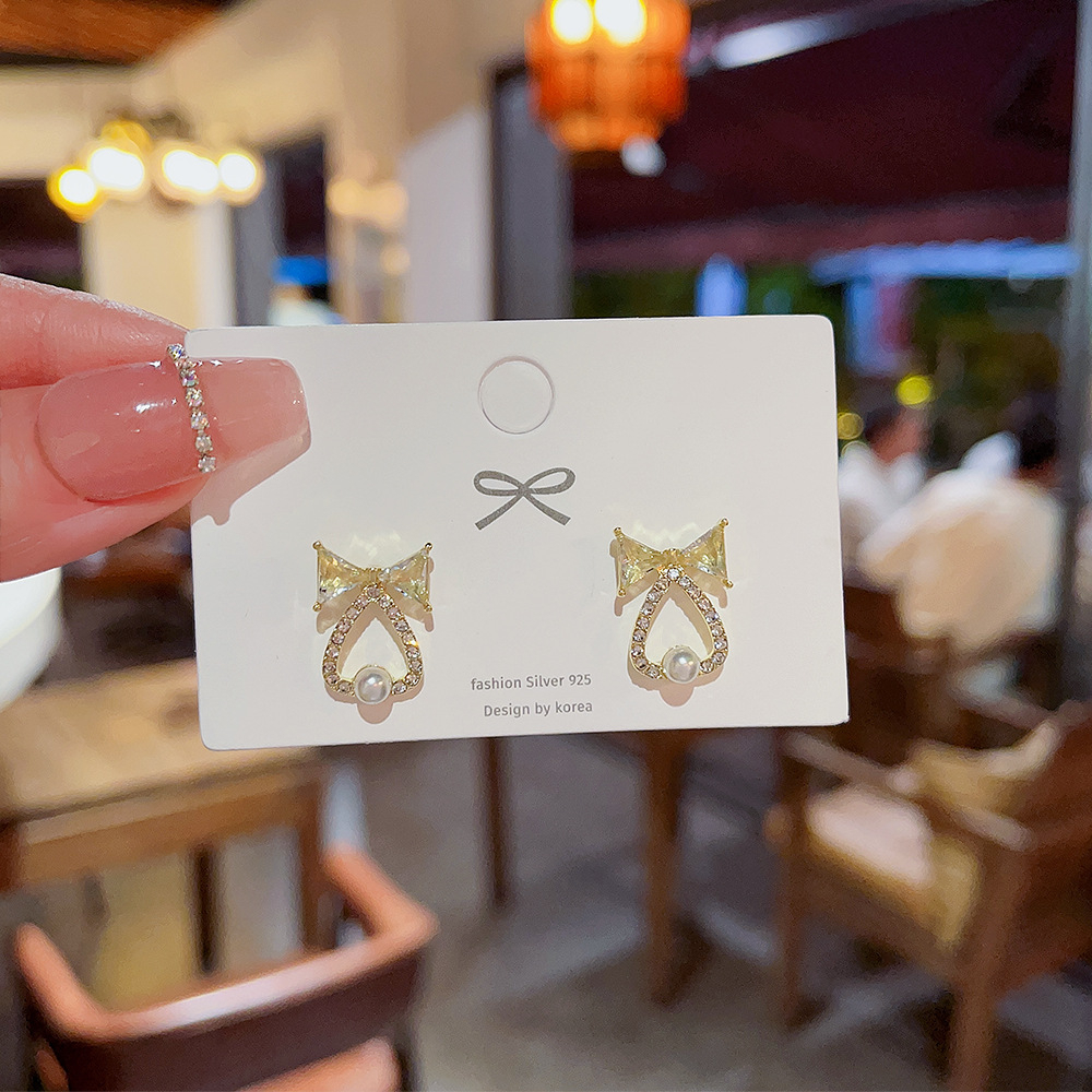 Detail XiaoboACC Anting Stud 925 Silver Needle Bentuk Pita Aksen Mutiara Bahan Zirkon Untuk Wanita