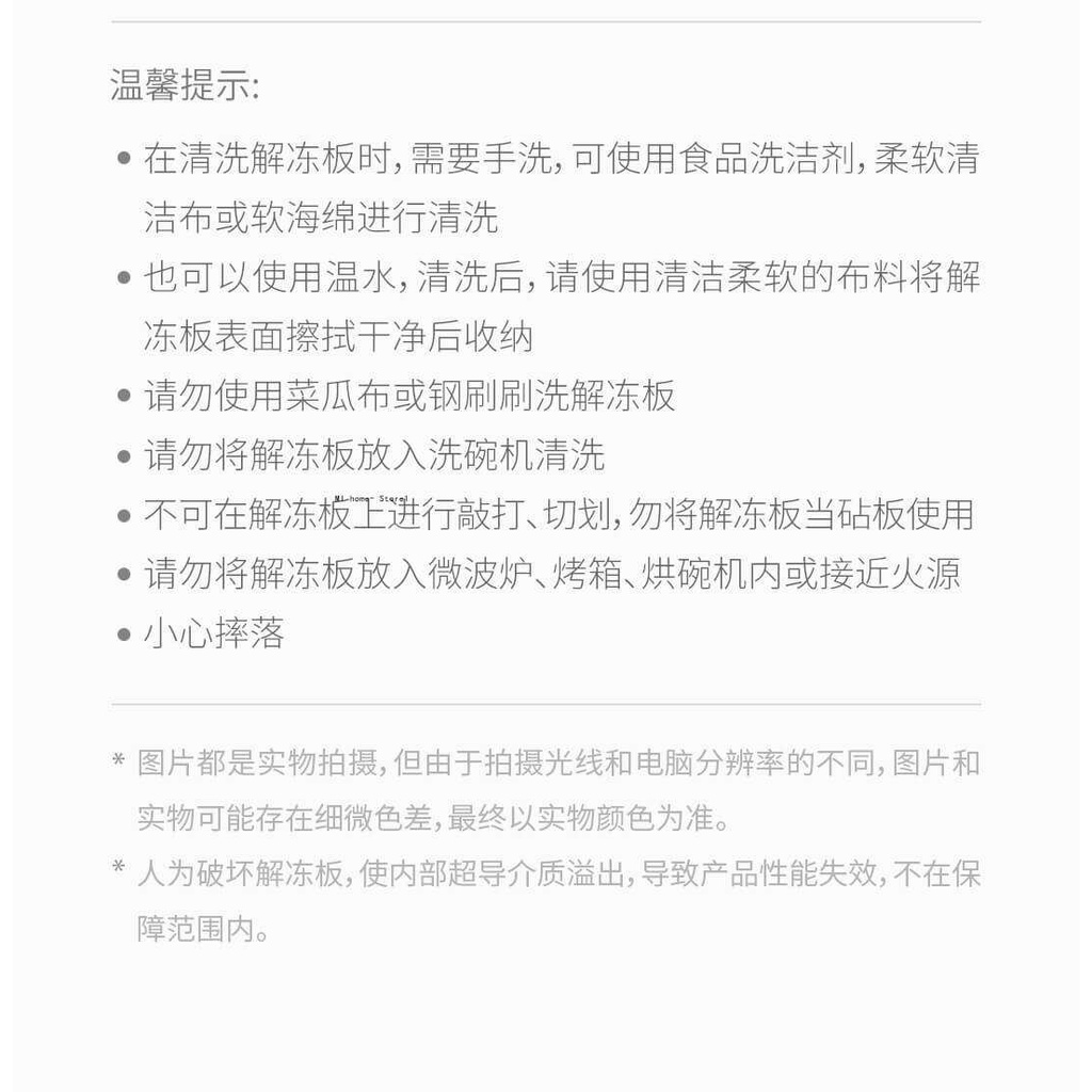 Warm Tips: Please do not use the defrosting tray as a cutting board in case of damaging the tray and affecting thawing effect.