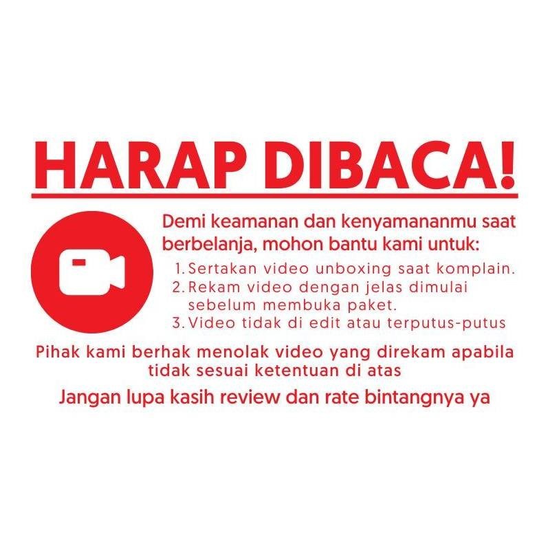 Demi kenyamanan dan keamanan berbelanja.. mohon bantu kami yaa. 1. Menyertakan video unboxing ketika komplain 2. Rekam video dengan jelas sebelum membuka paket 3. Mohon maaf, kami tidak menerima video yang direkam setelah paket dibuka serta video editan atau terputus-putus 4. Jangan lupa kasih review dan rate bintangnya ya