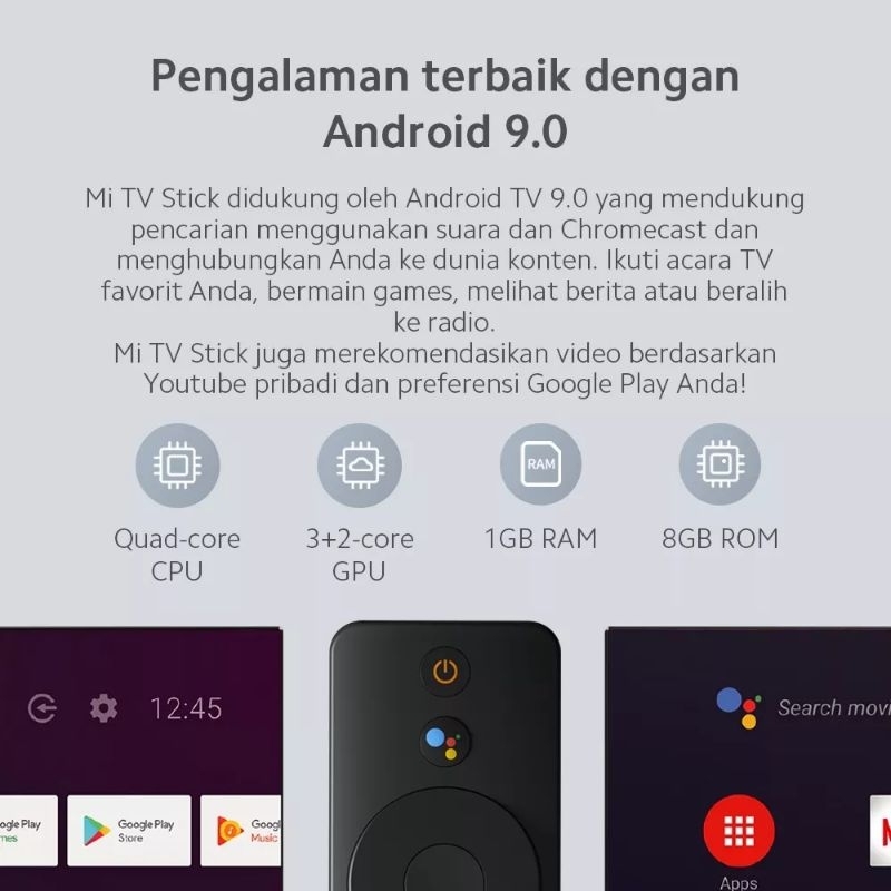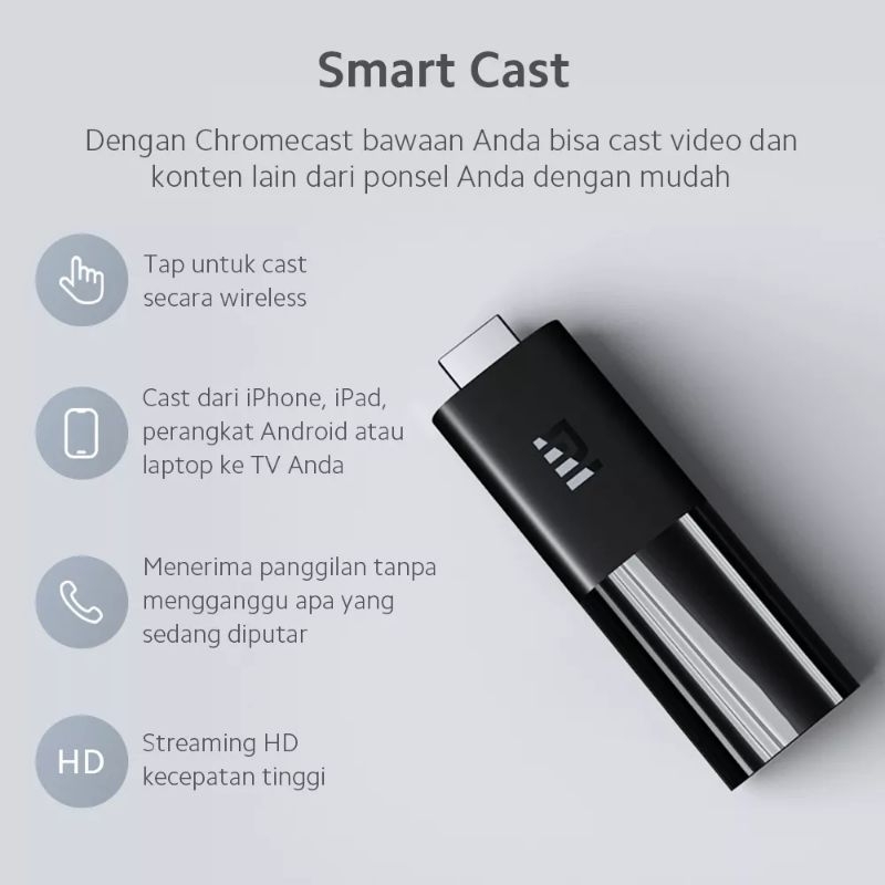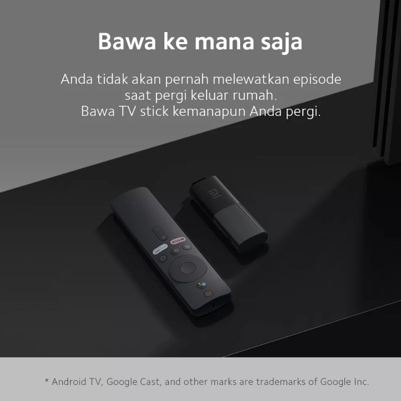 Xiaomi Mi TV Stick Ringan dan portabel. Dengan berat kurang dari 30g, TV Stick memiliki berat tidak lebih dari tomat ceri dan cukup kecil untuk dengan mudah dimasukkan ke saku. Lupakan kabel, colokkan stik ke TV, monitor, atau proyektor dengan port HDMI untuk mengubahnya menjadi Smart TV!
