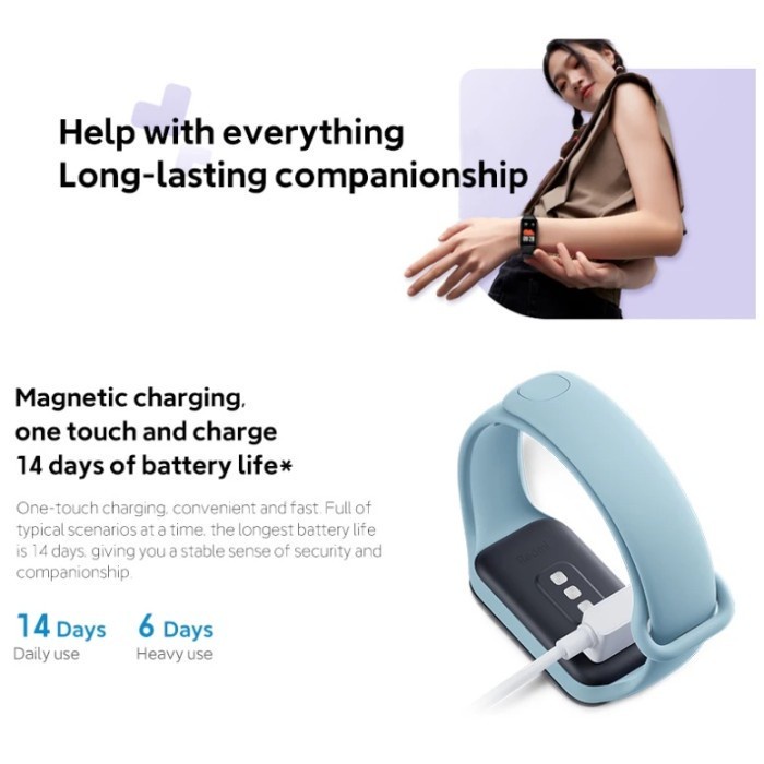 Pelacakan kebugaran skala penuh. Pemantauan detak jantung sepanjang hari. Pelacakan tidur tingkat lanjut. Pengukuran tingkat SpO2.