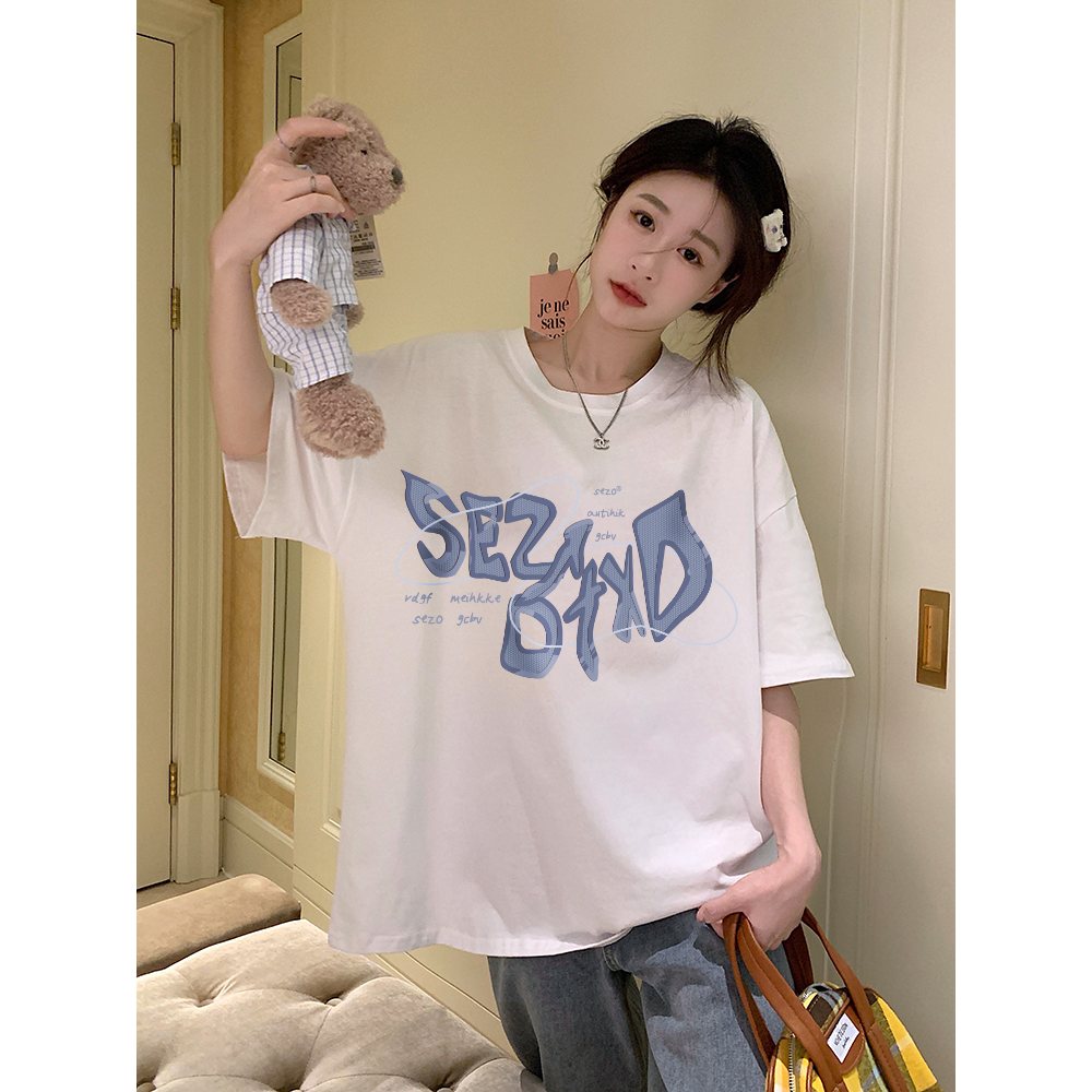Detail XiaoZhaiNv Kaos Atasan Wanita Huruf Biru Pattern Lengan Pendek A0639/Korean Style
