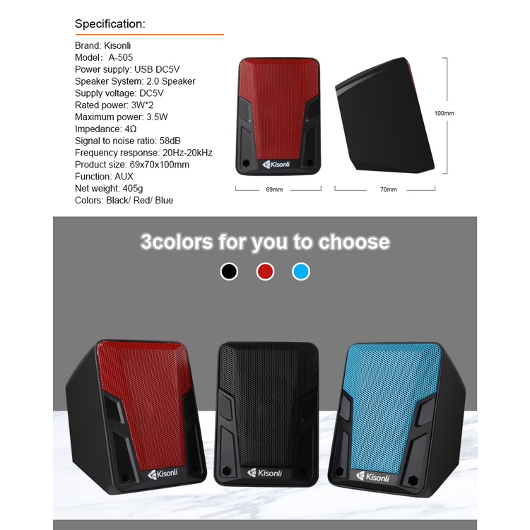 β€ Spesifikasi: β’ Brand: Kisonli β’ Model: A-505 β’ Produk Size : 65*65*105mm β’ Power Output: 3W X 2 β’ SNR: =58 dB β’ Frequency: 20Hz - 20KHz β’ Voltage USB: 5V