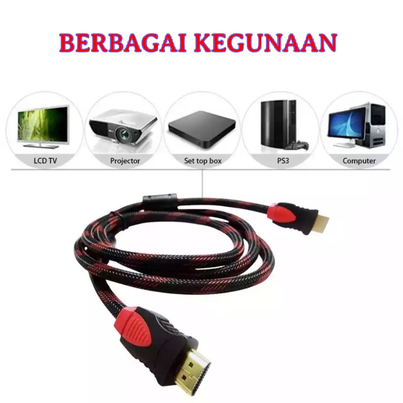 SPESIFIKASI : β HDMI TYPE: 1.4 VERSION β CONNECTOR TYPE : GOLD PLATED/NICKEL PLATED β COLORS : BLACK AND RED β MATERIALS : NYLON BRAIDED MESH,COPPER,PVC β LENGTH : 1.5 METER, 3 METER, 5 METER β OD : 6.8-8.5MM β CABLE TYPE : ROUND TYPE β PACKAGING : PLASTIK β USAGE : HDTV,HOME THEATER,DVD LAYER,PROJECTOR,PRINTER,COMPUTER ETC.