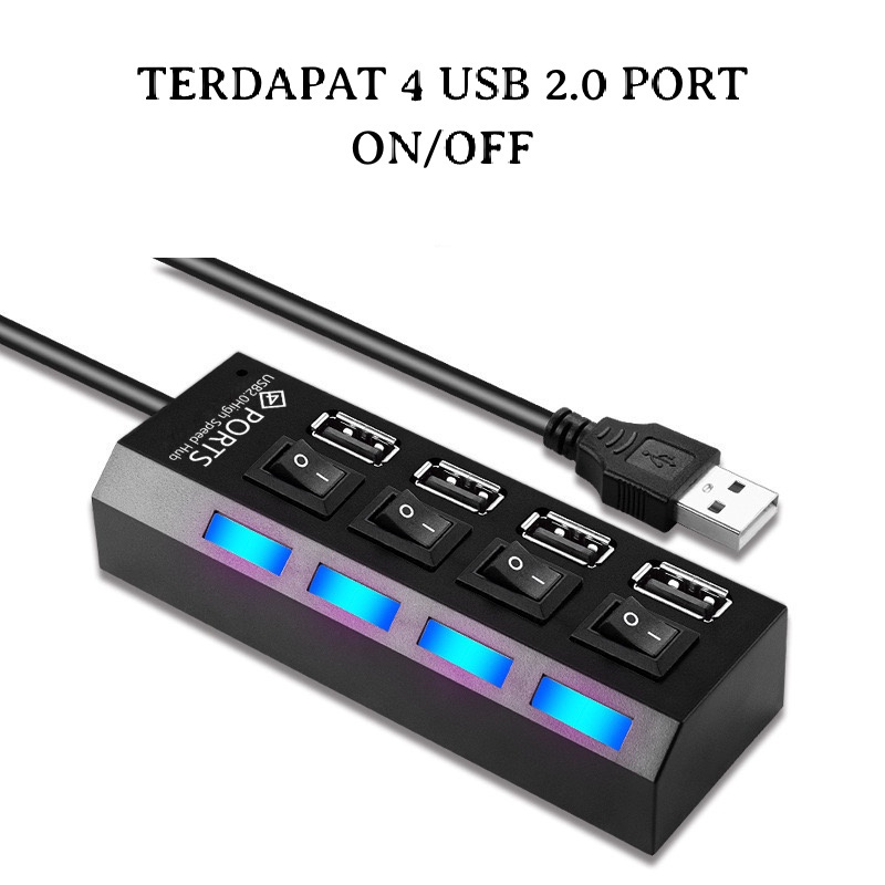 4 USB HUB DENGAN TOMBOL ON / OFF PADA MASING2 NYA. DENGAN LED BERWARNA BIRU SBG INDIKASI POWER CABLE LENGTH : +/- 70 CM COLOR : HITAM / PUTIH (DIKIRIM RANDOM = TIDAK BISA PILIH WARNA) PLUG AND PLAY