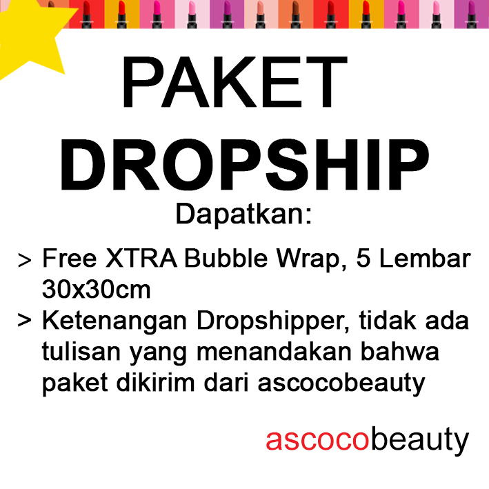 DROPSHIP + XTRA 5Lbr = Paket untuk pembeli Dropship termasuk: - XTRA BUBBLE WRAP 5 Lembar 30x30cm untuk pengiriman yang lebih aman - Ketenangan Dropshipper, tidak ada tulisan yang menandakan bahwa paket dikirim dari ascocobeauty