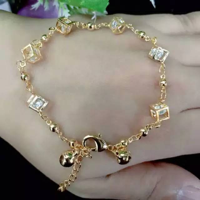 Gelang tangan dadu 1pcs warna gold dilapisi emas 24k tidak mudah pudar,dengan permata zircon sperti permata2 yg dijual emas2 beneran.. Unik dan sangan cantik