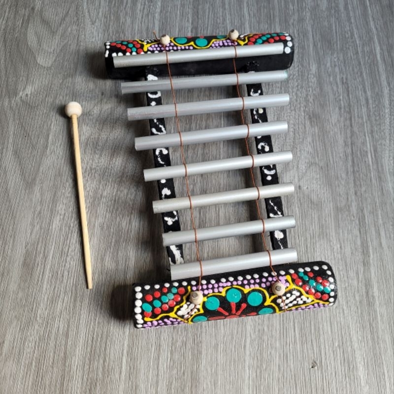 Spesifikasi : Bahan Kayu dengan Cat Finishing yang Unik Bahan Pipa Stenlis yang menghasilkan suara Khas Dilengkapi dengan Stik Pemukul