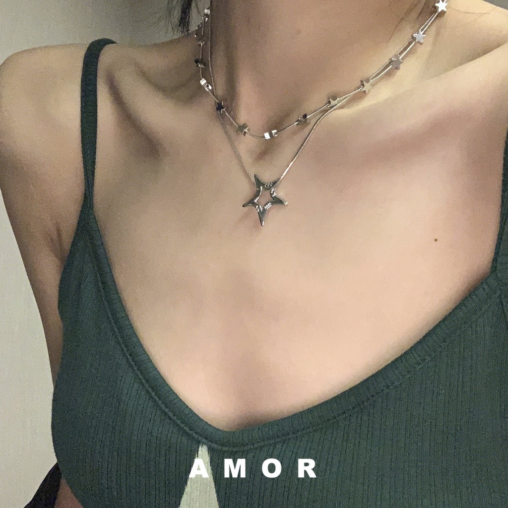 Detail Y2k Liontin Bintang Berlapis Ganda Memakai Kalung Cewek Pedas