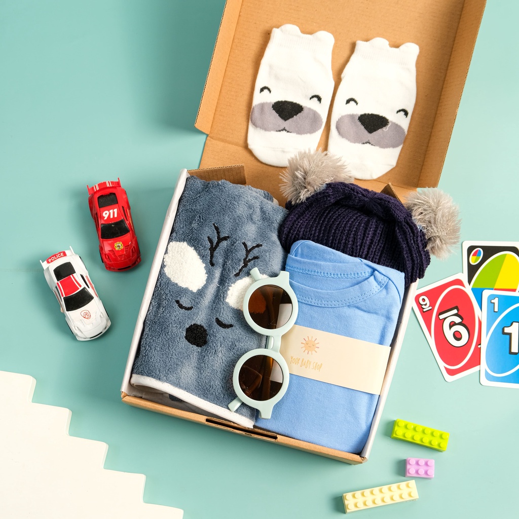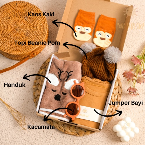 1box terdiri dari: - 1 pc jumper - 1 pc handuk (35x75 cm) - 1 pasang kaos kaki - 1 pc kacamata -1 pc topi pom Warna: Coklat,Abu,Biru,Pink,Kuning, Hijau *Free box pita dan kartu ucapan request ucapan di bagian pesan waktu checkout