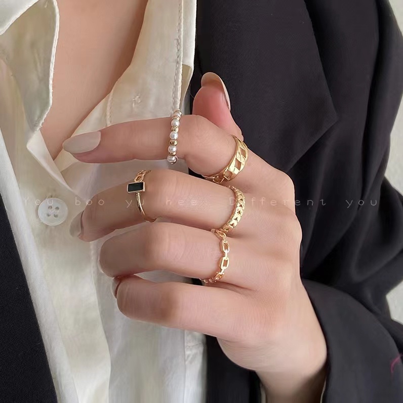 ๐ Nama: 5 Pcs/Set Fashion Cincin Mutiara Set Retro Hitam Persegi Permata Twist Rantai Cincin Manik-manik yang Dapat Disesuaikan Cincin Perak Emas untuk Aksesoris Wanita Perhiasan