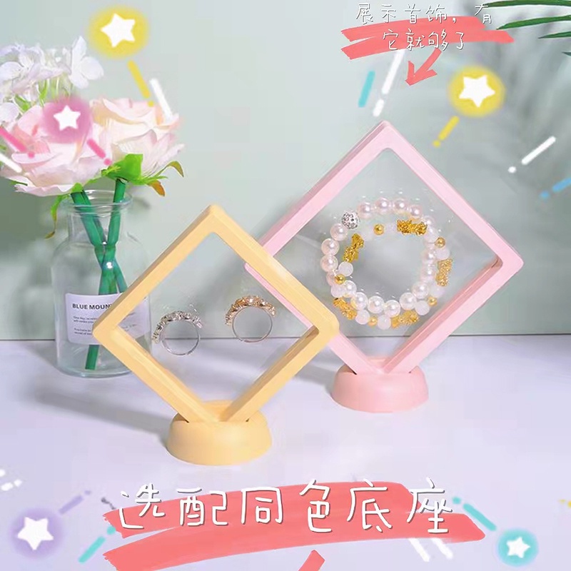 💛 Nama: Kotak Penyimpanan Antioksidasi Portabel Organizer Bingkai Terapung Cincin Tampilan 3D Gelang Kalung PE Film Segel Kotak Perhiasan