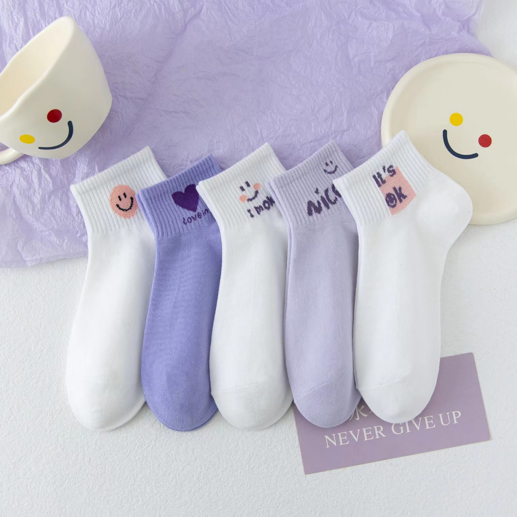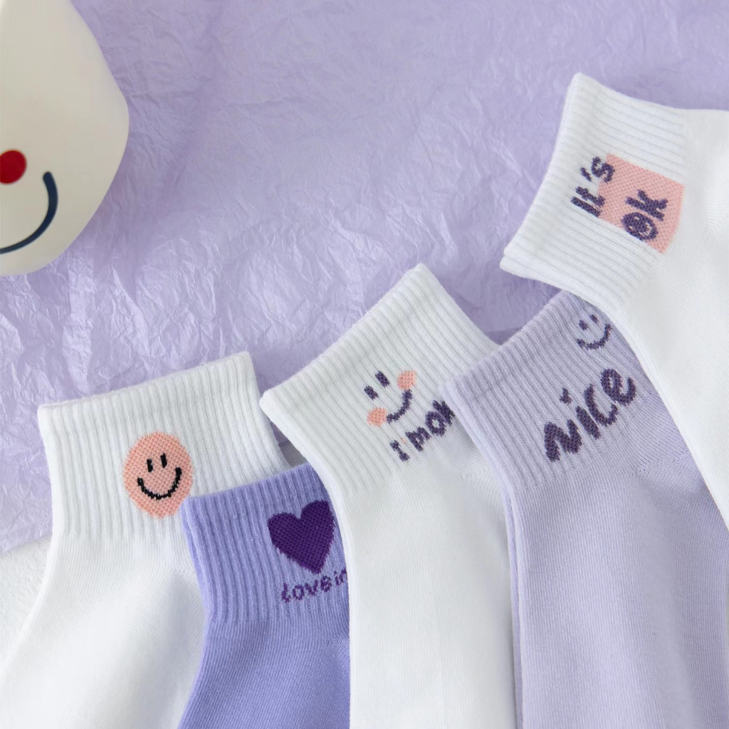 Sepatu Wanita > Kaus Kaki & Stocking > Kaus Kaki > •YF• KK1125 Kaos Kaki Pendek Wanita Motif Smile Ungu Fashion Korean Semata Kaki Putih Socks Import Ankle