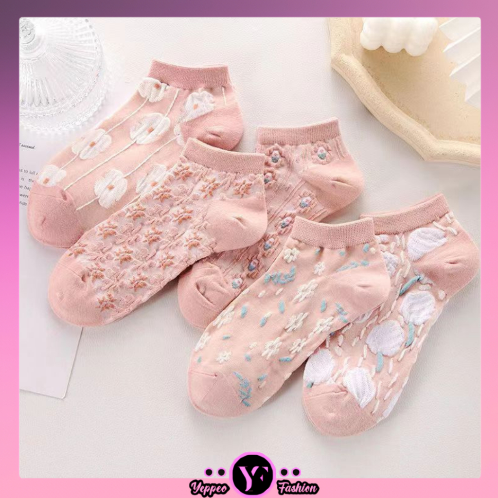 Detail •YF•KK1434 Kaos Kaki Pendek Wanita Motif Bunga Flower Pink Semata Kaus Kaki Socks Korean Fashion
