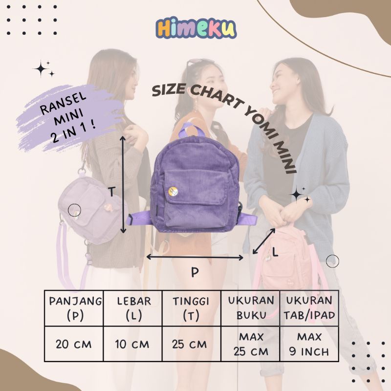 Ukuran : plt 20x10x25 cm Tali bisa diatur dan lepas pasang Bahan : Corduroy Terdapat 1 ruang utama, 2 slot dalam Free Pin Himeku