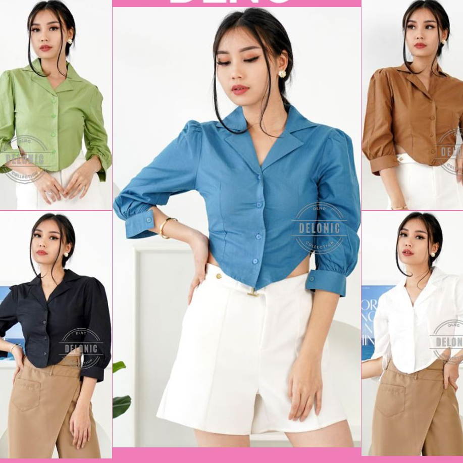 Kemeja Crop Atasan Wanita Bahan Crinle Kerah Blazer Pergelangan Tangan Kancing Satu