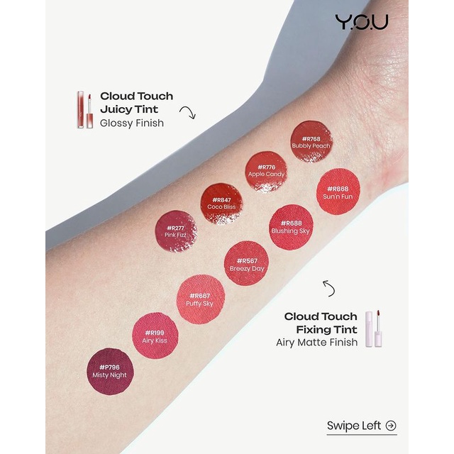 YOU Cloud Touch Juicy Tint adalah lip tint dewy dengan pilihan warna fresh yang memberikan tampilan bibir sehat & glowing natural.