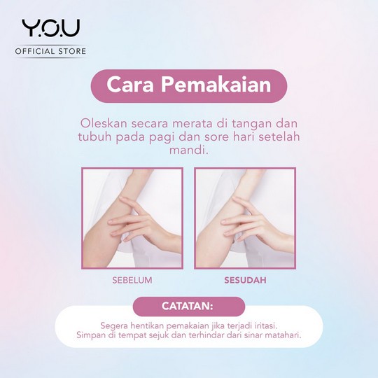 Cara Pemakaian: Oleskan secara merata di tangan dan tubuh pada pagi dan sore hari setelah mandi.