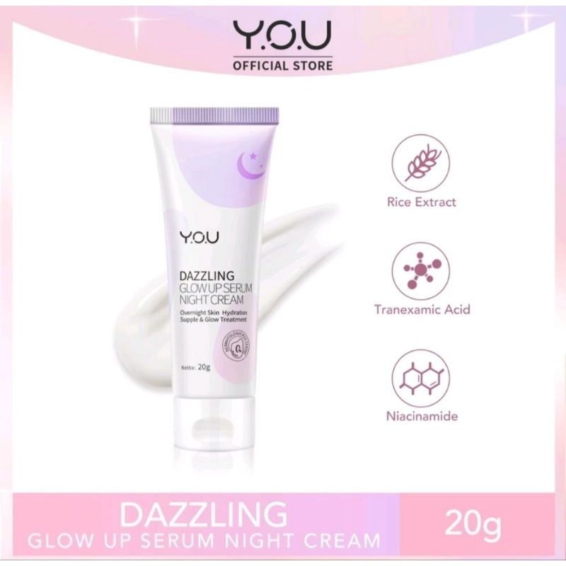 - YOU Dazzling Glow Up Serum Night Cream 40gr Serum Night Cream yang mengandung Rice Extract, Tranexamic Acid, dan Niacinamide yang menghidrasi kulit agar lebih lembut dan bercahaya keesokan harinya. Manfaat Overnight Skin Hydration : Menjaga hidrasi kulit sepanjang malam sehingga terasa lebih lembut di pagi hari. Supple & Glow Treatment : Menjaga elastisitas kulit dan membuat kulit tampak lebih bercahaya. Essential Skin Nourishment : Memiliki kandungan penting yang mampu menutrisi kulit secara mendalam. Cara Pemakaian : Aplikasikan secukupnya pada wajah yang telah dibersihkan setiap malam.