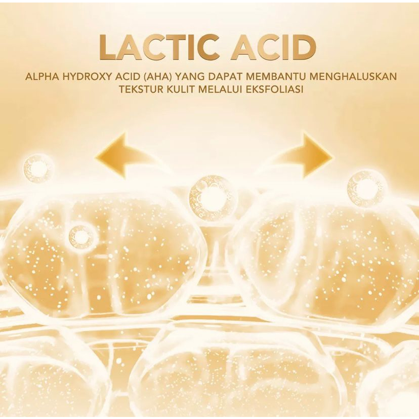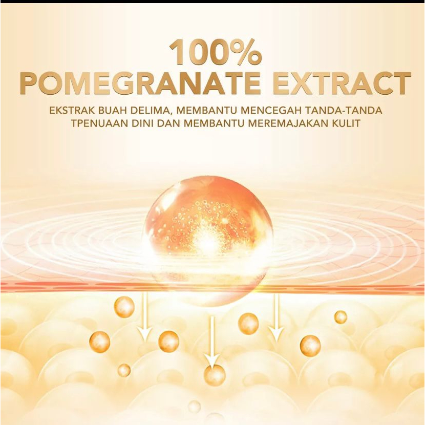 Punica Granatum Extract: Ekstrak Pomegranate (buah delima), membantu mencegah tanda-tanda penuaan dan memperbaiki kondisi kulit akibat penuaan Lactic Acid: Dikenal juga sebagai kandungan AHA yang diketahui dapat mengekfoliasi sel kulit mati dan menghidrasi kulit Niacinamide (B3): Membantu menyamarkan tampilan pori-pori dan garis halus, serta membantu meratakan warna kulit Allantoin: Melembapkan, menenangkan kulit, dan dapat membantu proses regenerasi kulit Calendulla Officinalis Flower Extract: Ekstrak bunga Pot Marigold yang membantu menenangkan kemerahan pada kulit