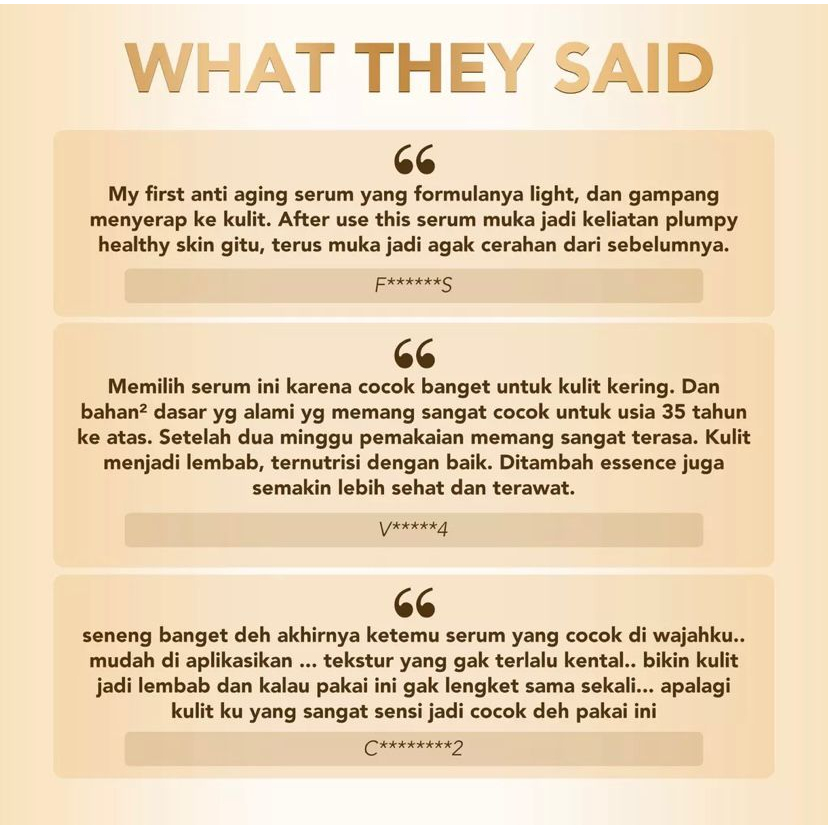 Cara Pemakaian: Aplikasikan secara merata pada seluruh wajah setelah penggunaan facial wash dan toner. Tidak lupa untuk diaplikasikan pada bagian leher dan tunggu hingga produk meresap. Dapat menggunakan rangkaian produk Golden Age untuk hasil yang lebih maksimal.
