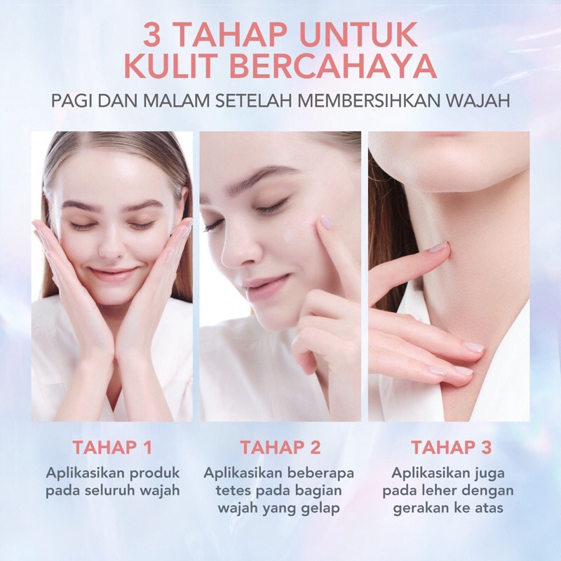 SELLING POINTS & BENEFITS: 1.9 Brightening Actives Menutrisi kulit dengan 9 Brightening Actives* untuk wajah yang sehat berseri. 2. 28 Days Radiant Skin Complexion Kulit tampak lembut dan sehat berseri dalam 28 hari. Special Ingredients: 1. Tremella fuciformis polysaccharide Ekstrak snow mushroom, memiliki kemampuan menyerupai Hyaluronic Acid sebagai pelembap dan berfungsi untuk menghidrasi kulit. 2. Niacinamide Vit B3, menyamarkan tampilan pori-pori, noda hitam, dan garis halus, serta meratakan warna kulit 3. 3-O-Ethyl ascorbic acid Vit C, kaya akan antioksidan dan melindungi kulit dari radikal bebas. 4. Hydrolyzed oat protein Protein yang berasal dari hasil hidrolisis gandum, bermanfaat untuk melembutkan, menenangkan, dan anti-inflamasi pada kulit. 5. Sodium Hyaluronate/Hyaluronic Acid Menghidrasi kulit dan membantu memperbaiki tekstur kulit. 6. Glycine soja (soybean) seed extract Ekstrak biji kacang kedelai, mengandung antioksidan alami yang meregenerasi, menenangkan, dan melembapkan kulit. 7. Moringa pterygosperma seed extract Ekstrak biji kelor yang menghaluskan tekstur kulit, menjaga kelembapan dan menenangkan kulit.
