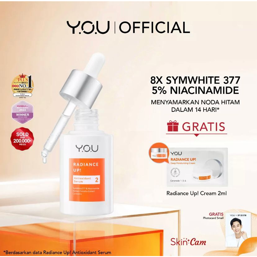 Y.O.U Radiance Up! Serum diperkaya dengan kandungan 8x SymWhite 377, 5% Niacinamide (B3), 2% Vitamin C, dan Ekstrak Licorice bekerja secara sinergis untuk membantu mengurangi kusam dan bintik hitam atau dark spot untuk tampilan kulit yang glowing. Dilengkapi dengan kandungan ekstrak Camellia Korea yang kaya akan antioksidan untuk melawan radikal bebas.