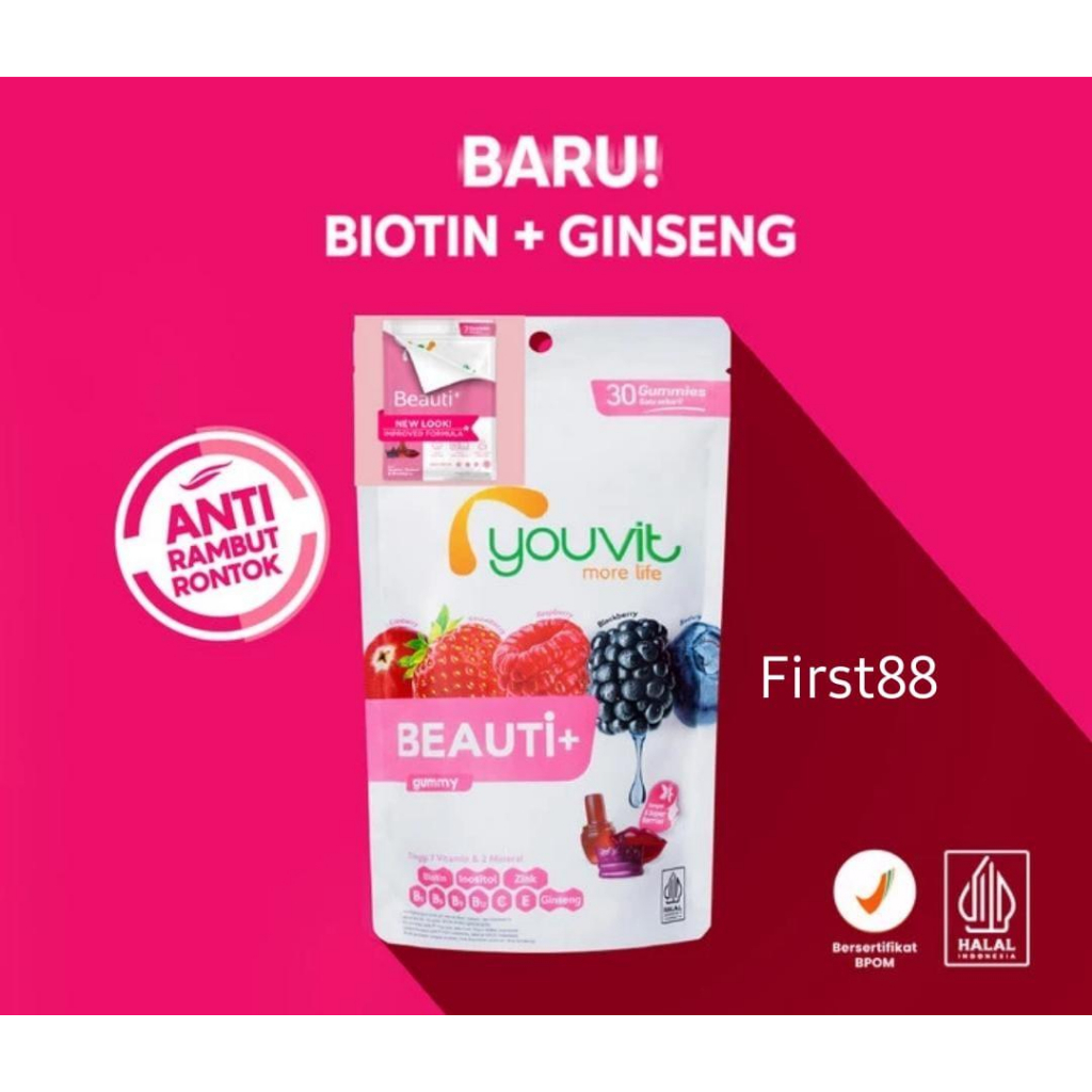 YOUVIT Beauti+ merupakan vitamin untuk merawat kecantikan kulit, rambut, dan kuku dari dalam. Kombinasi kandungan Inositol + Kolin, Vitamin E, dan Zinc di dalamnya berfungsi mencegah penuaan dini, menguatkan dan mengembalikan kilau rambut, serta menguatkan dan menyehatkan kuku. Tersedia dalam rasa buah berry yang lezat dan hadir dalam tiga bentuk cantik nan menggemaskan, yaitu lipstik, mahkota, dan botol parfum.